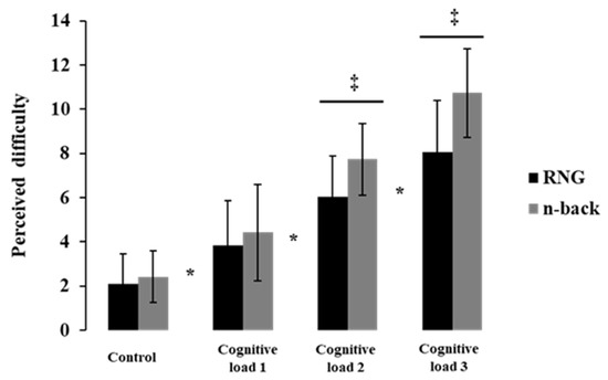 The perceived difficulty as a function of cognitive load and task. * p < 0.05 significant difference between control (CNT or 0-back) and others cognitive load (cognitive load 1: RNG1 or 1-back; cognitive load 2: RNG2 or 2-back; cognitive load3: RNG3 or 3-back); ‡ p < 0.05 significant difference between the tasks (RNG vs. n-back) during cognitive load 2 and cognitive load 3; error bars indicate standard error.