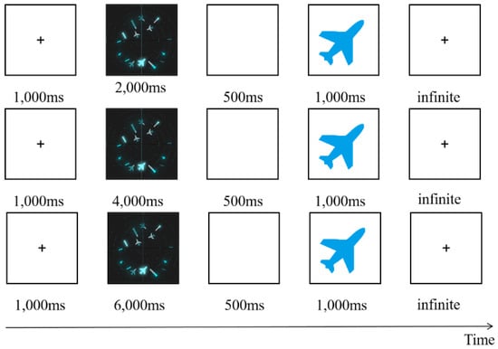 The experimental process under information pressure is shown in Figure 2. In order to familiarize participants with the task, they were allowed to practice before the experiment. In the first step, the subjects read the instructions and were then asked to look at the “+” in the center of the screen for 1000 ms. Then, the task interface appeared for 30,000 ms, followed by a blank screen for 500 ms. In the second step, a sample icon was randomly presented to the subjects. The information pressure was controlled by adjusting the amount of information (single information, double information, or three pieces of information) expressed by the sample icon. Subjects were asked to recall whether the sample icon appeared in the previous interface. In step 3, participants were asked to provide judgments and reactions after a blank screen appeared: “If the icon appears, press the ‘A’ key, and if it doesn’t, press the ‘L’ key”. In the last step, participants were asked to look at the “+” in the center of the screen for 1000 ms; then, the next round of tasks began. In the two experiments, the number and types of icons on the interfaces, as well as the information and order represented by the sample icons presented to the subjects, were the same for all three groups.