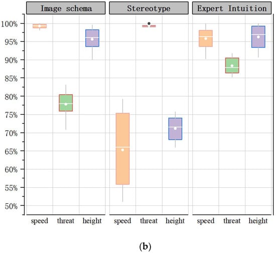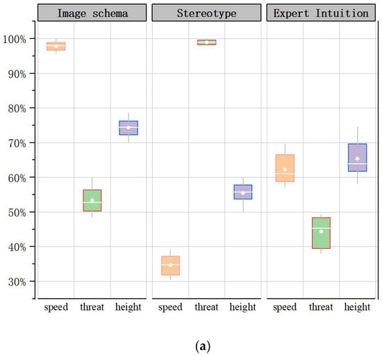 Kruskal–Wallis tests were conducted to investigate correctness between different types of tasks under the same time conditions. The correctness of subjects completing the three types of tasks under 2000 ms time pressure differed significantly between the imagery schema group, the stereotype group, and the expert intuition group (p = 0.024 < 0.05; p = 0.001 < 0.05; p = 0.012 < 0.05). Post hoc multiple comparison corrections were performed, and the results of the two comparisons differed significantly. The correct response rates under the 2000 ms and 4000 ms time pressure conditions are shown in the Figure 3 (subjects completed the task with an accuracy close to 100% under 6000 ms time pressure). In the imagery icon group, subjects under 2000 ms pressure were achieved a higher correctness rate on the search target speed task than the threat level and height tasks, with an average correct rate of 98%, 54.6%, and 73%, respectively; subjects under 4000 ms time pressure achieved a 93% correctness rate in completing the target height search task and a 95% correct rate under 6000 ms time pressure in completing the threat level search.
