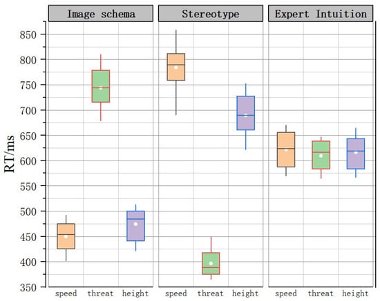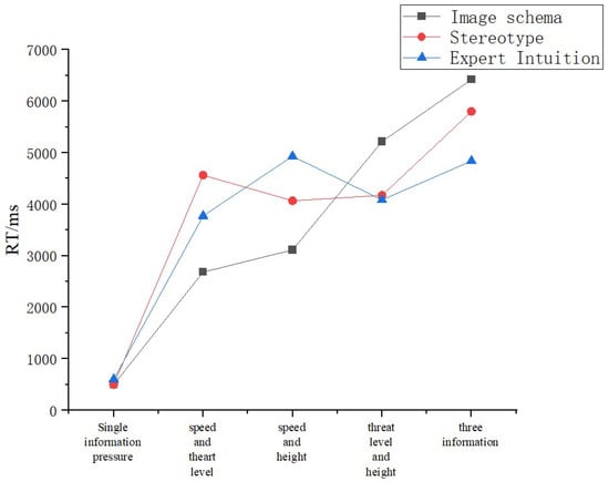 Reaction times are shown in Figure 9. A one-way ANOVA was performed on reaction times between groups for the same task, and the results showed significant differences between all groups. A one-way ANOVA was conducted on the reaction times of subjects under the same information pressure in the same group, and the results showed no significant differences in the two-task information pressure condition for the expert knowledge group only. As shown in Figure 9, the imagery schema group performed better under the single-task and dual-task conditions, but the total time spent on the three-task condition increased. The stereotype group spent more time than the imagery schema group on the speed and threat tasks.