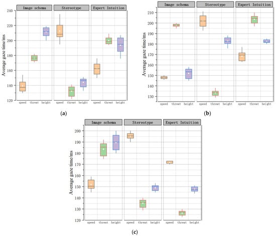 The mean gaze time represents the subjects’ search process time. Figure 5a shows that the mean gaze time of the stereotype impression group under 2000 ms pressure was short in the threat and height tasks, and the mean gaze time of the imagery icon group was shortest in the speed task. Figure 5b shows that the mean gaze time of the stereotype impression group under 4000 ms time pressure was short in the threat task, and the mean gaze time of the imagery icon group was shortest in the speed and height search tasks. Figure 5c shows that the mean gaze time of the stereotype impression group under 6000 ms time pressure was short in the threat and height tasks, and the mean gaze time of the imagery icon group and the stereotype impression group were similar in the speed task.