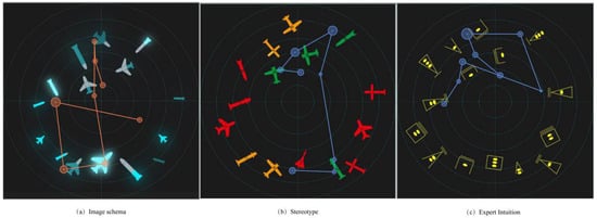 The subjects were divided into three groups—image schema, stereotype, and expert knowledge—with 20 people in each group. Subjects in the professional knowledge group were trained in radar operation. Each participant wore an electrode cap, sat in a comfortable chair in a room with soft light and sound insulation, and stared at the center of the screen. The distance between participants’ eyes and the screen was about 100 cm, and the viewing angle of horizontal and vertical pictures was within 2 cm. The eye movement equipment was turned on and calibrated. All the experiments were carried out from 10:00 to 12:00 in the morning, and 60 repetitions were carried out under medium pressure to ensure the reliability of the experiment.
