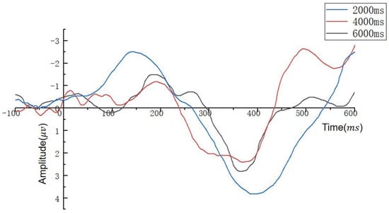 EEG signals were analyzed under different temporal pressures as follows: repeated-measures ANOVA was performed on the mean amplitude of 3 (i.e., 6000, 4000, and 2000 ms) × 7 (7 electrodes: PO4, P4, POz, Pz, CPz, PO3, and P3) from 250 to 750 ms. The ANOVA showed that the mean amplitude at electrode positions from 250 to 750 ms differed significantly between time pressure and electrodes because all p-values were less than 0.05. Therefore, an ANOVA was performed on the mean amplitude under time pressure in three brain regions (left, middle, and right), with the seven electrodes divided into right (PO4 and P4), middle (POz, Pz, and CPz), and left (PO3 and P3) groups. ANOVA results showed a significant main effect of the mean amplitude of brain regions under different temporal pressures (2000 ms: F(4,16) = 2.634, p = 0.045; 4000 ms: F(4,16) = 5.135, p = 0.014; 6000 ms: F(4,16) = 10.940, p = 0.012). Paired-sample tests were performed for the right, middle, and left mean amplitudes under different time pressures; if significant differences existed in any region, further t-tests were performed for the mean electrode amplitudes contained in each region to identify electrodes with significant differences under the three investigated time pressures. The results revealed a significant difference in the mean amplitude of Pz (p = 0.018). Therefore, the Pz potentials in the parietal cortex at different temporal pressures were of most interest; the P300 waveforms of the Pz electrodes are shown in Figure 8. The results of the comparison of the waveform amplitude and latency of the three groups of subjects on different tasks were as follows: 2000 ms > 4000 ms > 6000 ms.