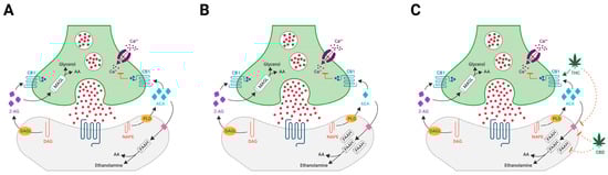 A series of diagrams illustrating the production of endogenous cannabinoids 2-AG and AEA from precursor molecules, their mechanism of action at the presynaptic CB1 receptors (with the resultant effect of reduced presynaptic calcium influx and hence neuronal excitement), and subsequent degradation by FAAH and MAGL. (A) Normal ECS functioning; (B) the ECS in EUPD showing an increase in FAAH-mediated degradation of AEA; (C) potential exogenous cannabinoid mechanism of action at the presynaptic CB1 receptor and at the postsynaptic deactivation of anandamide.