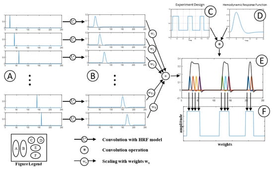 The observed signal is assumed to be a weighted sum of individual hemodynamic responses at different time instances. The colored plots in part (E) of Figure 1 show how the predicted response can be obtained as weighted sums of hemodynamic responses at different time instances. Each colored plot shows the hemodynamic response at different time instances. The first step in the approach is to form the design matrix. The design matrix consists of 3 main parts. First, an impulse function is generated for each TR (repetition time) (part A). This is convolved with an HRF model to form a series of hemodynamic responses that would have been generated by a pseudo-stimulus at every TR in this study (part B).