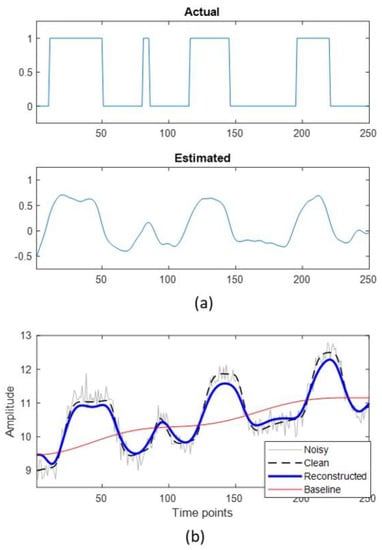 (a) The actual (top) and the estimated (bottom) stimulus for a synthetic time series data. (b) synthetic time series. Noisy time series was obtained by adding gaussian noise and signal drift to the clean time series. The noisy time series was used as input for the proposed approach to obtain the estimated time series and estimated signal drift (baseline).
