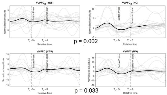 The temporal response from some of the brain regions depended on the user response for the apps. To identify the regions that responded differently for download and not download decisions, a paired t-test was performed. The algorithm extracts the pseudo-stimulus for all the apps whose download decision was either ‘yes’ or ‘no’. A paired t-test was performed on temporal response of each voxel and all participants. Only two brain region showed statistically significant difference in temporal response between ‘yes’ and ‘no’ response, the right ventrolateral prefrontal cortex (VLPFC) and the ventromedial prefrontal cortex (VMPFC). The VMPFC region has been shown to be involved in decision making involving reward [,,]. Figure 5 shows the temporal response for the voxel showing the maximum difference in each region. The response is shown for both ‘yes’ and ‘no’ apps and for all participants. It can be observed from the figure that there is more activation for ‘no’ apps as compared to ‘yes’ apps, right before the final decision time.