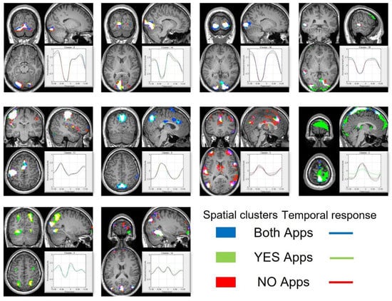 Finally, during the blanking period between two stimuli, activation is observed in the default mode network. The default mode network has been shown to be a task-negative brain region meaning it gets deactivated during the task and gets activated in the absence of any specific task []. An interesting temporal response is observed for the voxels within frontoparietal network. The temporal response shows a transient behavior where the activation peaks near button press and beginning of the new stimulus. The transient behavior of the temporal response may indicate the involvement of the region in task switching. Previous studies have suggested the role of frontoparietal network as a flexibility hub [] and in task switching []. Video S1 and Figure 4 show the application of the proposed approach in extracting the dynamic spatial and temporal response to the app download decision-making task.