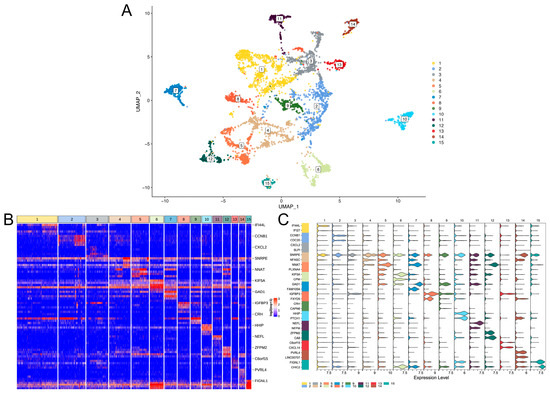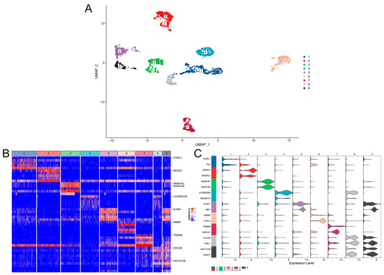 Unsupervised clustering of pediatric GBM cells. (A) UMap dimensionality reduction of clustering results. The X-axis and Y-axis represent the two dimensions of the UMap dimensionality reduction space. The points in the figure are cells, and all cells are colored separately according to the cluster labels. (B) The expression heat map of specific genes of cell clusters. Only the top five genes with significant differences in log2FC of each cell cluster are shown, and the gene name is annotated for the first gene. The upper color bar corresponds to each cell cluster. (C) Violin diagram of cell cluster-specific gene expression. The upper numeric label and the color bar on the left represent each cell cluster. The X-axis is the expression value, and the Y-axis is the gene. Only the top two genes with significant differences in log2FC of each cell cluster are shown.