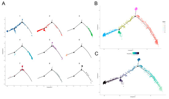 The pseudotime value of each cell was calculated through “Monocle” based on change of gene expression. Each cell was arranged in the trajectory according to the pseudotime value, so as to fit the developmental process of the cell. Therefore, coloring the trajectory based on the pseudotime value can visually reveal the development process of cells.
