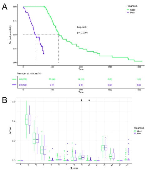 Prognostic analysis of cell clusters. (A) Survival curves of different prognosis groups. The X-axis is time (days), and the Y-axis is survival rate. Patients are divided into two groups: good-prognosis and poor-prognosis. Survival curves are drawn, and a log-rank statistical test is performed. (B) Box diagram of cell cluster content. The X axis shows 15 cell clusters of adult GBM cells, and the Y axis shows CIBERSORT score (cell content). * represents p < 0.05 (Wilcoxon rank-sum test).