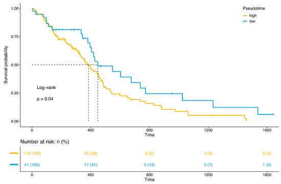 Combined with the previous cell trajectories, we found that cell cluster 9 was in the middle and late stages of overall cell development, while cell cluster 10 was in the early stage. Therefore, we hypothesized that the state of cell development would have an impact on the prognosis, and that late-state cells would have an adverse impact on the prognosis. To test our hypothesis, the concept of pseudotime value of the patient samples was constructed based on the pseudotime of single cells, and the patients were regrouped into a high-pseudotime-value (late-stage) group and a low-pseudotime-value (early-stage) group. The results show (Figure 7) that there was a significant difference in the survival prognosis between the two groups (Log-rank test p = 0.04), suggesting that the time status of cells has a significant impact on the prognosis of patients.