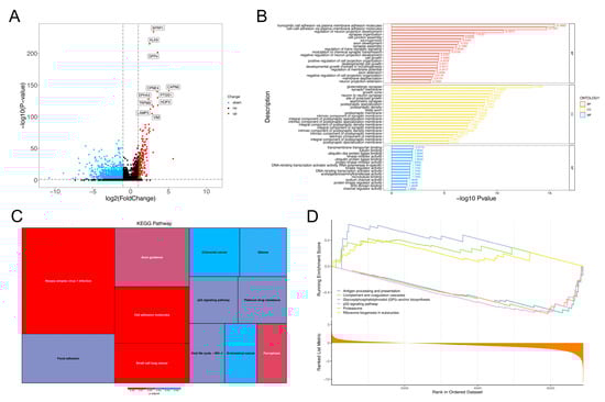 Biological functions of cell cluster 9. (A) Volcano map of specific genes. X-axis is log2FC value, Y-axis is -log10 (corrected p value). Blue points are down-regulated genes, red points are up-regulated genes and black points are genes with no significant differences. (B) GO enrichment bar chart. (C) KEGG enrichment analysis. Colors represent the corrected p values and areas represent the number of genes enriched into the pathway. (D) GSEA enrichment line chart.