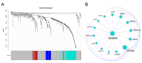 The biological characteristics of cell cluster 9 are regulated by some key genes. The identification of these key genes provides new ideas for clinical practice. The WGCNA method was used to mine gene modules, and there were three effective gene modules (Figure 9A). These gene modules were then exported in the form of a network and imported into Cytoscape for visualization and further topological property analysis after quality control. In the network (Figure 9B), the degrees of SHISA9 and ASTN2 are significantly higher than those of other genes. We then checked the expression trend of the two genes in the whole development process, and the results show (Figure 10) that the expression trend of the two genes was basically the same. In the early and middle stages, the expression of the two genes showed a slight downward trend and essentially remained stable, while in the late stage, the expression of the two genes increased sharply.