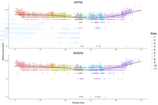 Analysis of gene expression trend. The X-axis is the pseudotime value, and the Y-axis is the expression value. The time states of the cells are shown in different colors.