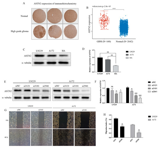 ASTN2 increases the migration ability of GBM cells. (A) ASTN2 is not specific for GBM and is also expressed moderately in normal glial cells. (B) Bioinformatic analysis shows that the expression of ASTN2 in GBM is significantly higher than that in normal brain tissue. (C,D) Western blot results show that the expressions of ASTN2 in GBM lines are significantly higher than that in HA. (E,F) Effects of ASTN2 siRNAs on down-regulation of ASTN2. The results show that si3181 and si2941 are effective in both LN229 and A172 cell lines, and the effect of si3181 is relatively stable. (G,H) Wound healing assay shows that control group cells healed the wound to a greater extent than the ASTN2 interference group cells after 48 h. **** p < 0.0001, *** p < 0.001, ** p < 0.01, * p < 0.05.