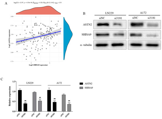 ASTN2 and SHISA9 have a significant positive correlation. (A) Bioinformatics analysis results show a significant positive correlation between ASTN2 and SHISA9. (B,C) Western blot shows that the expression of SHISA9 decreased after down-regulation of ASTN2. ** p < 0.01.
