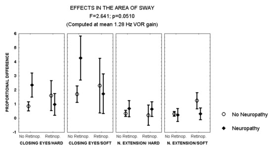 Mean and standard error of the mean of the proportional difference in the area of sway after closing the eyes or extending the neck, while standing either on hard or soft surface, according to the evidence of retinopathy or polyneuropathy. Statistical significance is provided according to the overall result of the MANCOVA, including the variables described in the Figure.
