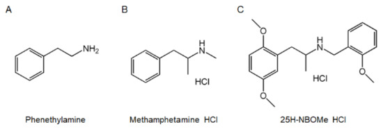 Chemical structures of phenethylamine (A), methamphetamine HCl (B), and 25H-NBOMe HCl (C).