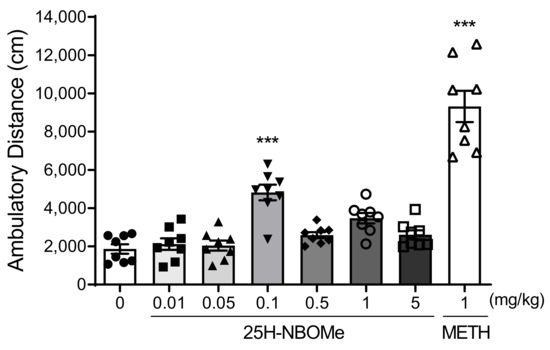 Effect of 25H-NBOMe administration on the locomotor activity in mice. Mice administered with vehicle (saline), METH (1 mg/kg), and 25H-NBOMe (0.01, 0.05, 0.1, 0.5, 1, and 5 mg/kg) were administered, and the distance traveled (cm) was measured during a 1-h test period (0: filled circles, 25H-NBOMe 0.01 mg/kg: filled squares, 25H-NBOMe 0.05 mg/kg: filled triangles, 25H-NBOMe 0.1 mg/kg: filled down triangles, 25H-NBOMe 0.5 mg/kg: filled diamonds, 25H-NBOMe 1 mg/kg: empty circles, 25H-NBOMe 5 mg/kg: empty squares, METH 1 mg/kg: empty triangles). Data are expressed as mean ± SEM (n = 8 each group). *** p < 0.001 vs. vehicle, determined by a one-way ANOVA followed by Bonferroni’s post-hoc test.