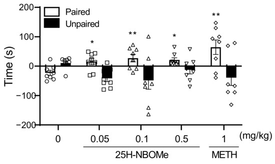 Effect of 25H-NBOMe administration on the place conditioning paradigm in mice. Time difference spent in the drug-paired (white bar) and drug-unpaired (black bar) compartment between the drug administration group and the vehicle (saline) group during pre-conditioning and post-conditioning (0: circles, 25H-NBOMe 0.05 mg/kg: squares, 25H-NBOMe 0.1 mg/kg: triangles, 25H-NBOMe 0.5 mg/kg: down triangles, METH 1 mg/kg: diamonds). Data are expressed as mean ± SEM (n = 8 each group). * p < 0.05; ** p < 0.01 vs. vehicle, determined by a two-way ANOVA followed by Bonferroni’s post-hoc test.