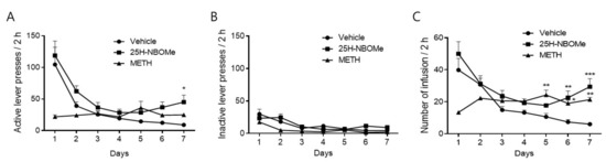 The SA test was conducted for 2 h/session per day with a fixed ratio of 1 and a time-out schedule of 20 s. Mice having access to METH (0.1 mg/kg/infusion, i.v.) and 25H-NBOMe (0.01 mg/kg/infusion, i.v.) exhibited increased activity of lever presses on days 5, 6, and 7 compared to activity exhibited by the vehicle group. Moreover, mice having access to 25H-NBOMe exhibited significantly increased active lever presses on day 7 (Figure 4A). There was no significant difference in the number of inactive lever presses between all groups (Figure 4B). In both the 25H-NBOMe and the METH groups, the number of infusions increased significantly compared to that in the vehicle group (Figure 4C).