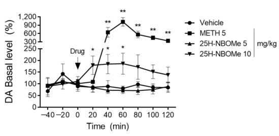 The dopamine (DA) levels in the striatum after i.p. administration of vehicle (saline), METH (5 mg/kg), and 25H-NBOMe (5 and 10 mg/kg). The black arrow indicates when the drug is administered. Data are expressed as mean ± SEM (n = 3–4 each group). * p < 0.05, ** p < 0.01 vs. vehicle, determined by a two-way ANOVA followed by Dunnett’s post-hoc test.