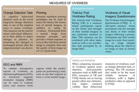 - Runge, M.; Bakhilau, V.; Omer, F.; D’Angiulli, A. Trial-by-Trial Vividness Self-Reports Versus VVIQ:A Meta-Analytic Comparison of Behavioral, Cognitive and Neurological Correlations. Imagin. Cogn. Personal. 2015, 35, 137–165. [Google Scholar] [CrossRef]