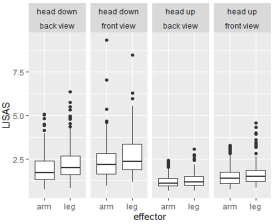 Boxplots of the linear integrated speed-accuracy scores (LISAS) depending on rotation (head-down, head-up), perspective (back view, front view), and limb (arm, leg) in Study 1.