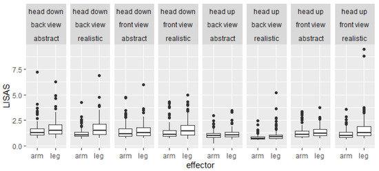 Boxplots of the linear integrated speed-accuracy scores (LISAS) depending on perspective (front view, back view), rotation (head-up, head-down), abstractness (realistic, abstract), and limb (arm, leg) in Study 2.