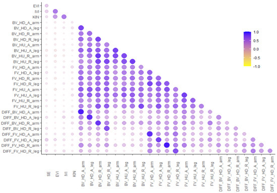 Pearson correlations between self-efficacy (SE; [49]) vividness of external visual (EVI), internal visual (IVI), and kinesthetic (KIN) imagery [7] and linear integrated speed-accuracy scores depending on perspective (front view: FV, back view: BV), rotation (head-up: HU, head-down: HD), abstractness (realistic: R, abstract: A), and limb (arm, leg). Additionally, correlations of the difference score (DIFF) of each condition with the baseline (back view head-up) are shown. Larger and darker circles indicate larger correlations.