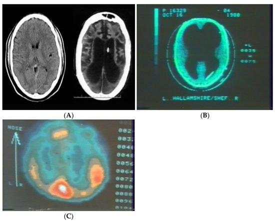 (A) Normal CT-scan (Left) and that of patient T.S. in persistent vegetative state resulting from anoxia during childbirth (Right). (B) CT of congenitally hydrocephalic individual within the normal to above average range of intellectual capacity. (C) Xe-gas regional cerebral blood flow of individual in (B) while performing mental arithmetic.