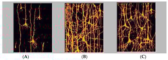 We see the complexity of dendritic structures of cortical neurons consistent with expansion of synaptic connectivities as a function of age. ((A), 5 days; (B), 6 years, (C), adult) [21].