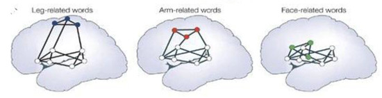 This concept is most readily seen when examining the nature of embodied language., It is less important to understand that Broca’s area is in the frontal lobes, anterior to the Sylvian fissure is responsible for expressive language, and that the temporal lobes, and Wernicke’s area, in particular, in the left temporal region is responsible for receptive language. More to the point, as evidenced in Figure 4, is that the networks are different for leg, face, or arm rerated words [75]. Education’s function is to build associative networks of the kind evidenced in embodied language [76,77].