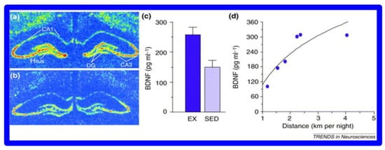 BDNF increases in mouse hippocampus (a) After 7 days of volunteer wheel running compared to (b) sedentary (SED) mice. (c) BDNF levels as a function of exercise (EX) v. sedentary behavior (SED) (d) correlation between the distance of wheel running and BDNF levels. (with permission [79]).