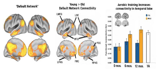 The left-hand panel represents the “default network” (DN) in healthy students of college age. The aging process has negative effects on network interconnectivities represented in the middle panel in particular within a major regional hub that involves the posterior cingulate. In contradistinction, the righthand panel inter-region connectivities (synchronous activity) of the DN following a one-year of aerobic exercise program in comparison to the non-aerobic control group. Walkers after a year demonstrated interregional connectivities not significantly different than college aged young adults (YA) (with permission [80]).