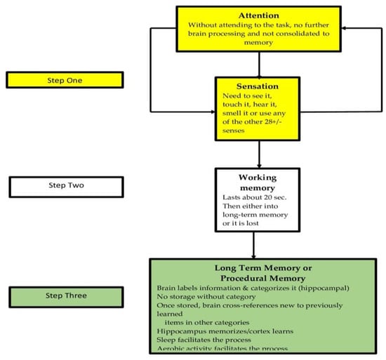 School teachers with a grounding in developmental cognitive neuroscience could possess a greater understanding of the types of memory and how they are formed can select strategies that are more likely to improve the retention and retrieval of learning as represented in Figure 7. Learning and retention are different. We can learn something for just a few minutes and then lose it forever. Retention can be affected by many factors that include: focus effectiveness of individual [135], rehearsal length and type [136] identification of the critical attributes of the information being taught [137], the learning pattern of the individual [138], and prior learning’s inescapable influence on the effects of pro- v. retroactive inhibition [139,140].