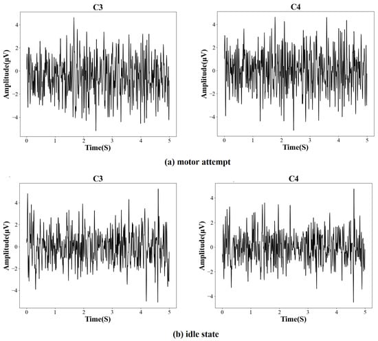 According to Figure 1, the EEG signals of each trial were recorded for 11 seconds and started with a white arrow image used to prompt the patient to be prepared. Three seconds later, a task cue (red geometrical shapes) was displayed on the screen, and the patient was asked to perform either a movement attempt or a rest state. After the cue disappeared, the patient was told to continue performing the task following the cue until the white cross disappeared. Then, the patients rested for 1.5 s. The recorded signals were sampled by a 32-channel EEG cap, and the EEG electrodes were placed according to the international 10–20 system. The sampling frequency was 200 Hz. Data from 31 channels were used for calculation, and the filter range was 4 to 40 Hz. Some examples of the preprocessed EEG signals (C3, C4) from the motor function areas of the brain are shown in Figure 2. Five seconds of EEG before the white cross disappeared from each trial were extracted for training the model.