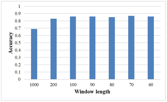 To investigate the effect of window size, we experimented with multiple window sizes and evaluated the performances of the models in the corresponding window. The sizes of the comparison time windows were 1000, 200, 100, 90, 80, 70, and 60. Figure 5 presents the average accuracy of the six methods for the different windows. The lowest accuracy was achieved when the window size was 1000, which means without data augmentation. The most likely reason for this phenomenon is probably because the models overfit fewer training data. We illustrate the performance of each method for three window sizes in Table 4. The LSTM&VS accuracy was 90.3% when the window size was 70. However, the LSTM model showed only a classification accuracy of 65.4% without using a time window. The difference in accuracies occurred because the different window sizes changed the lengths of the input time series. In addition, according to the results, when the window size was 70, the average accuracy of each method was higher than that of the method with a window size of 100. This may indicate that relatively small sizes of windows had better performance.
