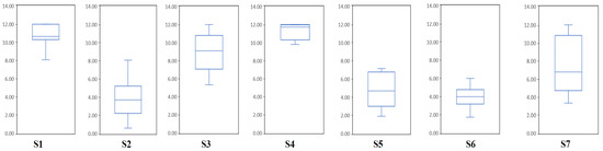 Boxplots represent the ITRs of different sessions for each subject. Each box plot includes 12 sessions of data. The upper and lower lines represent the maximum and minimum ITRs, respectively. The lines in the boxplot represent the median ITR.