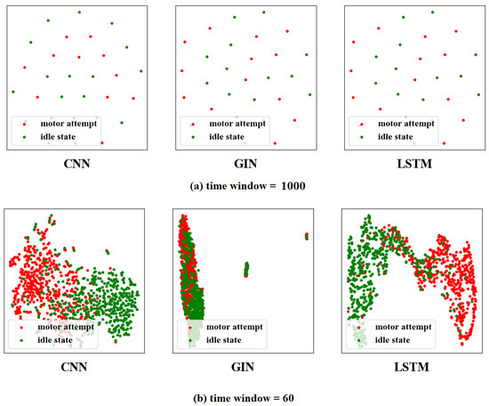 Feature visualization of different models for Subject 1. For time window (a), each scatter represents a feature extracted on one trail, and for time window (b), each scatter represents a feature extracted on one time window of one trail.