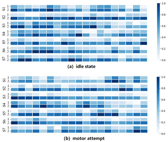 In this section, to analyze the classification differences in each time window, we conducted statistics and visualized the classification results of the EEG signals on the windows by using the LSTM&VS method. Figure 9 shows the sequence of classification results. Each row represents a session, and each column represents the classification statistics of the time window, in which the time windows with higher accuracy are highlighted. As seen in the figure, the distribution of accuracy across the time windows differs in patients. For Subject 3, the time window with higher classification accuracy appeared in the first window, and the window with lower classification accuracy appeared in the last window. The difference in sequence probably occurred because the appearances of the discriminative motor intentions were random during the MA experiment.