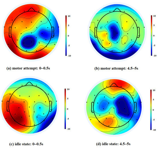 To further investigate the differences in the EEG signals of time segments with different classification accuracies, we used power spectral density topography to represent the frequency domain information of brain signals. Figure 10 illustrates the topography of alpha power for two tasks. Based on the classification accuracy of the time segments in Figure 9, four different time windows were selected for visualization. For the motor attempt task, the PSD of patients was higher in the frontal lobe. Several studies have indicated that stroke can affect the brain function in the frontal lobe [39,40]. The observations may suggest that motor attempts of patients were associated with the frontal cortical regions, which is consistent with a previous study [41]. Channel information from frontal regions may be important for identifying the brain’s motor intentions. When the EEG signals in the frontal lobe are not significant enough, it may contribute to lower classification accuracy.