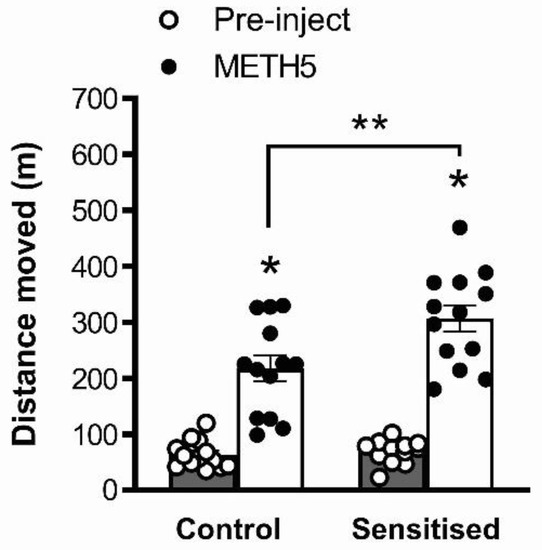 3.1. METH Pretreatment Results in Sensitisation of Acute METH-Induced Locomotor Hyperactivity