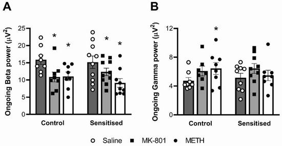 3.2. Ongoing Beta, but Not Gamma Power, Is Reduced by MK-801 and Acute METH