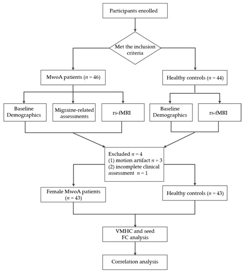 This study was designed as a cross-sectional study to observe VMHC alterations and seed-based FC changes in female MwoA patients compared to HCs. The screening, enrollment, exclusion, and assessment process is outlined in the flow chart (Figure 1). The sample size was calculated according to the estimation of statistical power in fMRI. At least 24 participants were required to achieve 80% power at the single voxel level for typical activations and multiple comparison correction [24,25].