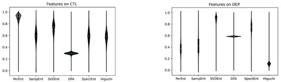 Figure 3 shows the distributions of non-linear features: permutation entropy (PerEnt), sample entropy (SampEnt), single-value decomposition entropy (SVDEnt), detrended fluctuation analysis (DFA), spectral entropy (SpectEnt), and Higuchi’s fractal dimension (Higuchi) by groups (CLT on the left and DEP on the right) after applying a MinMaxscaler.