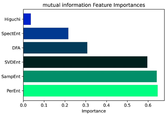 Features ranking through the mutual information of fermutation entropy (PerEnt), sample entropy (SampEnt), single-value decomposition entropy (SVDEnt), detrended fluctuation analysis (DFA), spectral entropy (SpectEnt), and Higuchi’s fractal dimension (Higuchi).