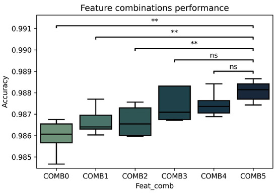 Accuracy comparison between non-linear selected features. COMB0 (PerEnt), COMB1 (PerEnt + SampEnt), COMB2 (PerEnt + SampEnt + SVDEnt) COMB3 (PerEnt + SampEnt + SVDEnt + DFA) COMB4 (PerEnt + SampEnt + SVDEnt + DFA + SpectEnt), COMB5 (PerEnt + SampEnt + SVDEnt + DFA + SpectEnt + Higuchi); p-value annotation legend: ns: non-significant; ** p < 0.01.