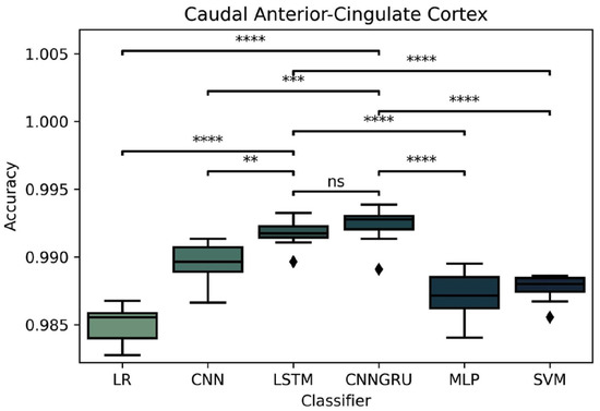 Having fixed the time-window span to 15 s, the brain area CACC with its associated electrodes (FC2, AFz, F2) and the nonlinear features (PerEnt, SampEnt, SVDEntr, DFA, SpectEnt, Higuchi), a 10-fold cross-validation test harness to ML and DL classifiers was applied: logistic regression (LR), support vector machine (SVM) with radial basis function (RBF) kernel, multilayer perceptron (MLP), convolutional neural networks (CNN), long short-term memory (LSTM), and newest CNN + GRU (CNNGRU) proposed classifier by Liu W. [11]. The accuracy was selected as a metric score. The t-test comparisons between pairs of classifiers in accuracy led to the results illustrated in Figure 6. As can be seen, the highest accuracy was obtained for the LSTM and the CNNGRU, which did not differ significantly. However, the LSTM showed better performance than CNN (p <0.01) or LR, MLP, and SVP (p <0.0001). CNNGRU showed better performance than CNN (p < 0.0001) and LR, MLP, and SVP (p < 0.0001).